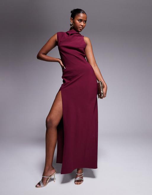 ASOS DESIGN – Vinröd maxiklänning i satin med asymmetrisk ringning
