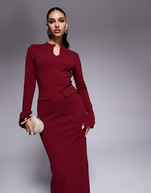 ASOS DESIGN – Vinröd midiklänning i scubaliknande tyg med långa ärmar och ficka