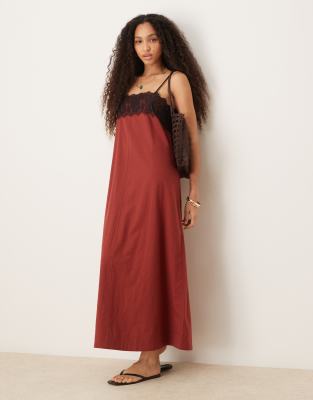 ASOS DESIGN – Vinröd midiklänning med spetsöverlager och smala axelband