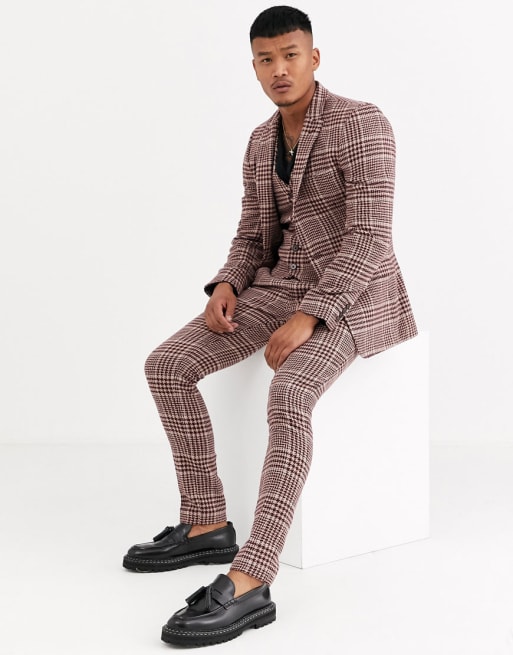 ASOS DESIGN – Vinröd och kamelfärgad, rutig kostym i superskinny fit i ullmix