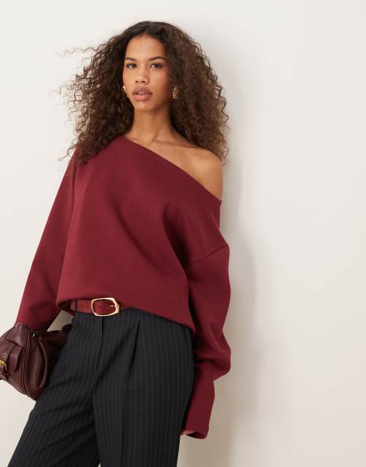 ASOS DESIGN – Vinröd oversize-sweatshirt i dubbelvävd jersey med off shoulder