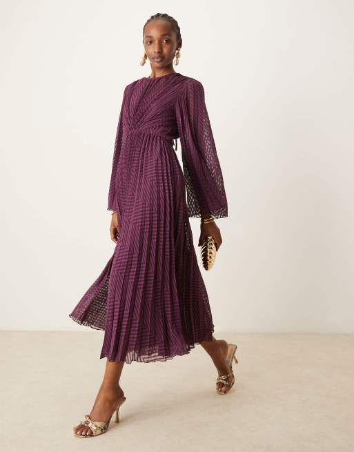 ASOS DESIGN – Vinröd plisserad midiklänning i chiffong med chevronmönster, knytning baktill och utställda ärmar