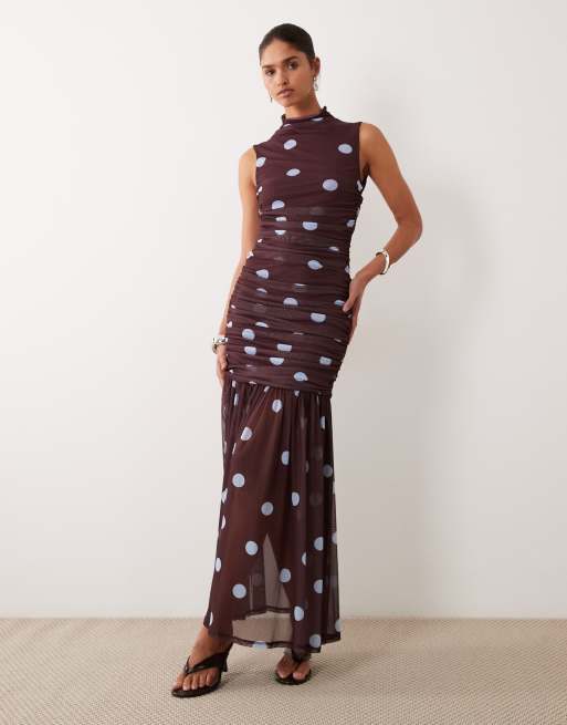 ASOS DESIGN – Vinröd, prickig klänning med cirkeldesign, rysch, låg midja och grown on-krage