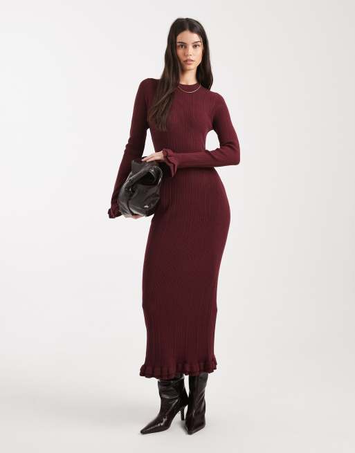ASOS DESIGN – Vinröd, ribbad och stickad maxiklänning med volangärmar