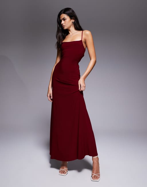 ASOS DESIGN – Vinröd slipklänning i satin och maxilängd med snörning baktill