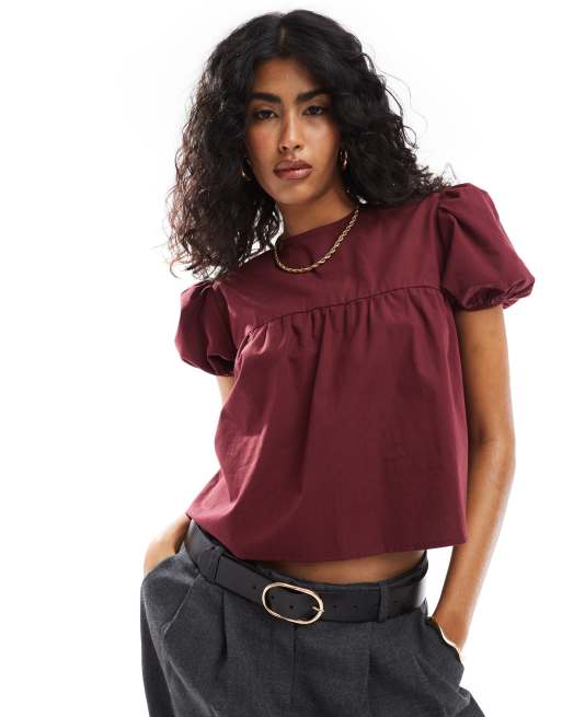 ASOS DESIGN – Vinröd, smockad topp med puffärmar