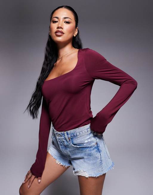 ASOS DESIGN – Vinröd topp i två lager med långa ärmar och vid, fyrkantig ringning