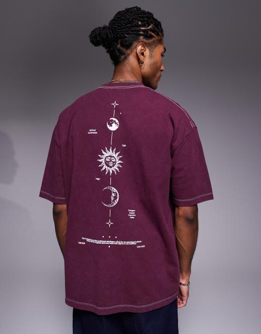 ASOS DESIGN – Vinröd, tvättad, kraftig t-shirt i oversize med astrologitryck på ryggen