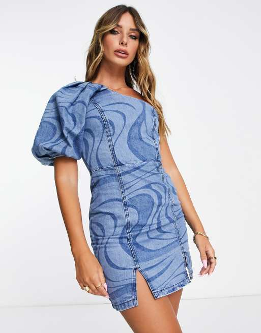 ASOS DESIGN – Virvelmönstrad jeansklänning med puffärmar - LBLUE