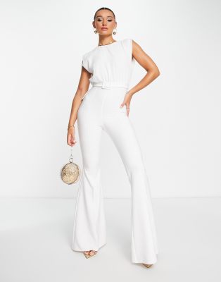 ASOS DESIGN – Vit jumpsuit med utsvängda ben, skärp och chiffongöverdel