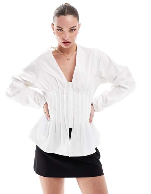ASOS DESIGN – Vit korsettopp i bomull med v-ringning och volymärm
