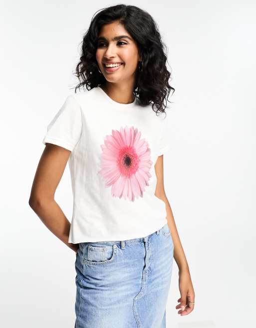 ASOS DESIGN – Vit, kort t-shirt med rosa blomtryck
