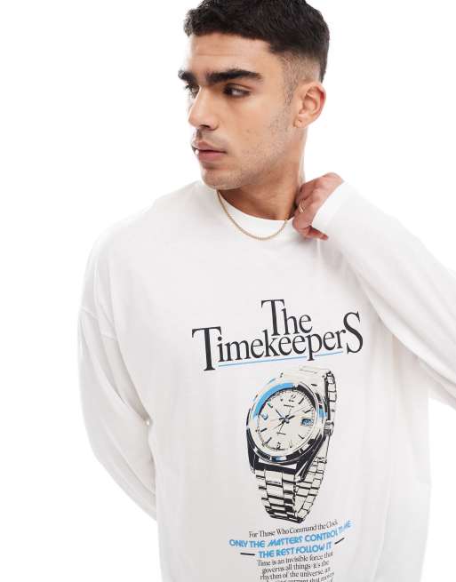 ASOS DESIGN – Vit, långärmad t-shirt i oversize med klocktryck
