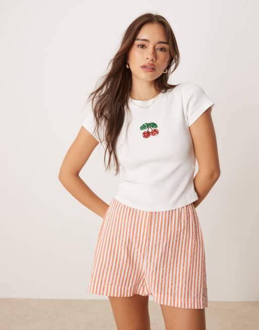 ASOS DESIGN – Vit, liten t-shirt med körsbärsbroderi
