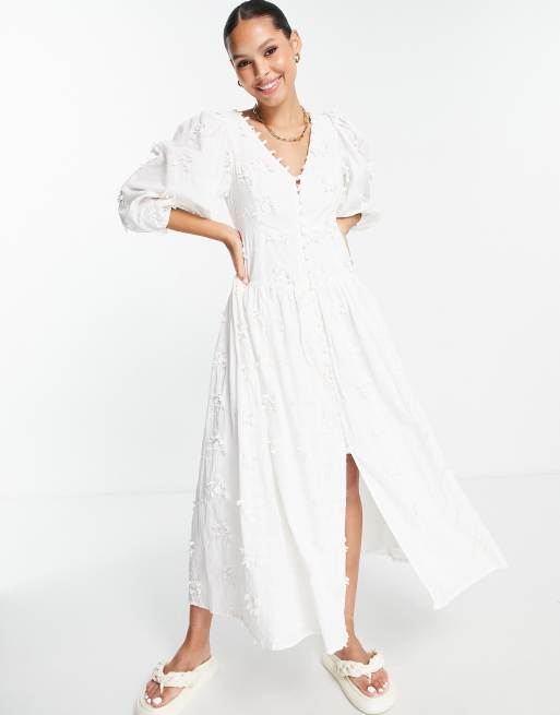 ASOS DESIGN – Vit midiklänning med stora ärmar, knäppning och 3D-blommor