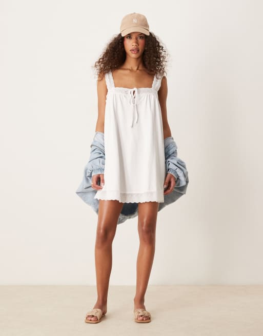 ASOS DESIGN – Vit, smockad miniklänning med fyrkantig ringning och spets
