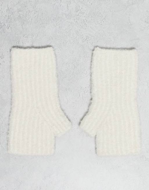 ASOS DESIGN – Vita, ribbstickade fingerlösa handskar i bouclé
