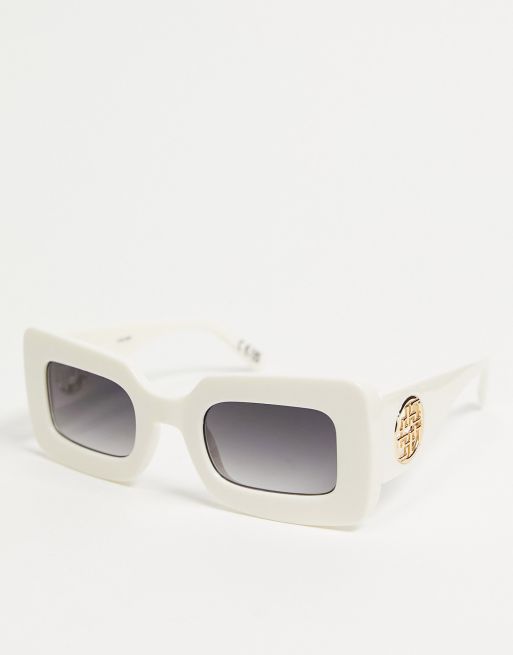 ASOS DESIGN – Vitglansiga, fyrkantiga solglasögon i grov modell med monogram i metall på skalmarna