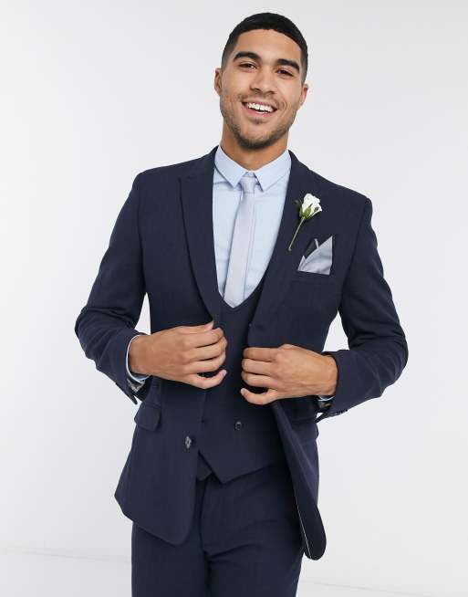 ASOS DESIGN Wedding – Marinblå fiskbensmönstrad kavaj i ullblandning med extra smal passform