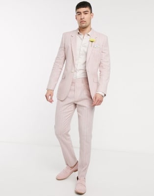 ASOS DESIGN wedding – Rosa- och vitrandig kostym i bomull och linne med stretch och smal passform