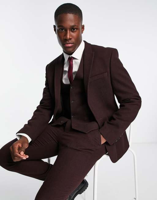 ASOS DESIGN Wedding – Vinröd smal kavaj i ullmix med fiskbensmönster, del av kostym