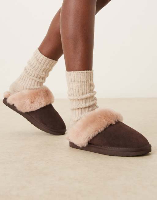 ASOS DESIGN – Zamber – Premium – Chokladbruna tofflor i fårskinn och mocka