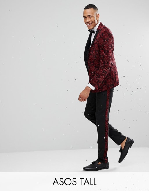ASOS TALL – Röd smoking i paisleymönstrad sammet med extra smal passform