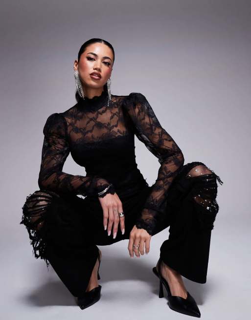 ASOS X THE SOURCED COLLECTION – Svart topp med hög krage, puffärmar och spetsinslag