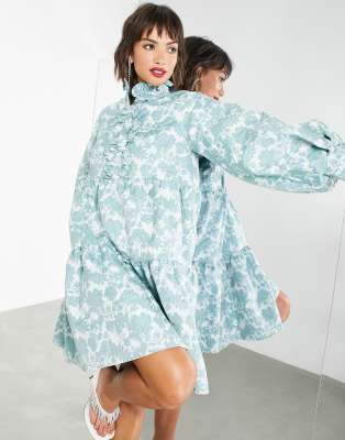 ASOS EDITION – Blå blommig smockklänning i jacquard med veckad ståkrage
