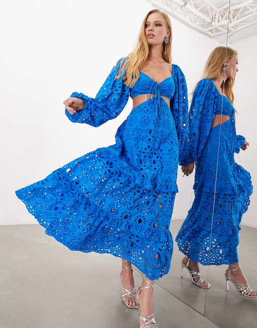 ASOS EDITION – Blå midiklänning med blusärmar, utskurna detaljer och broderie anglaise