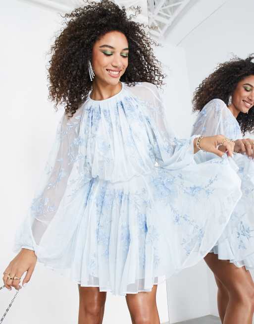 ASOS EDITION – Blekblå miniklänning med blusärmar i blombroderad mesh