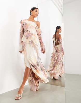 ASOS EDITION – Blekrosa blommig maxiklänning med bara axlar, asymmetrisk design och volanger