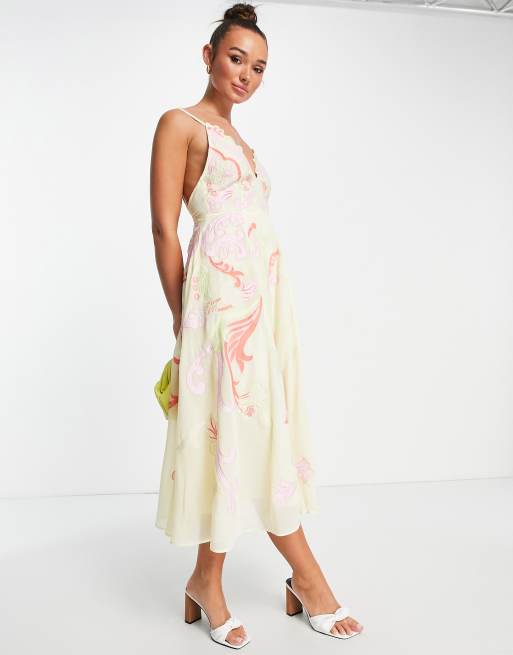 ASOS EDITION – Citrongul broderad midiklänning med smala axelband och applikationer