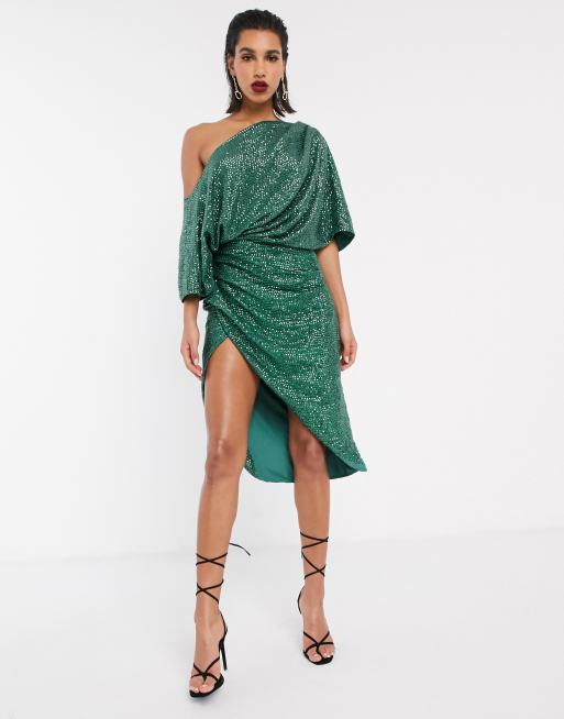 ASOS EDITION – Draperad, asymmetrisk midiklänning med paljetter