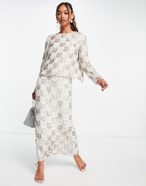 ASOS EDITION – Elfenbensvitt set utsmyckat med draperade pärlor i rutmönster med topp och kjol