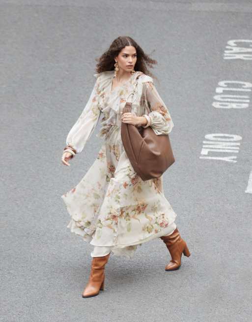 ASOS EDITION – Gräddvit, blommig maxiklänning i chiffong med dragsko i midjan, volanger och råskurna kanter