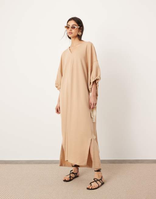 ASOS EDITION – Kamelfärgad oversize tröjklänning i jersey med v-ringning och kontrastfärgade knytband