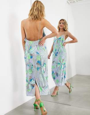 ASOS EDITION – Ljusblå slipklänning i midilängd med blommor i neon och smala axelband