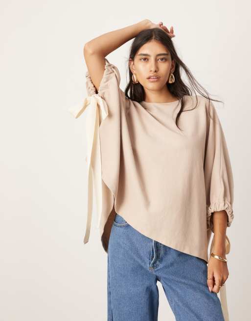 ASOS EDITION – Ljusbrun, slouchy topp i oversize och jersey med kontrastfärgade knytband