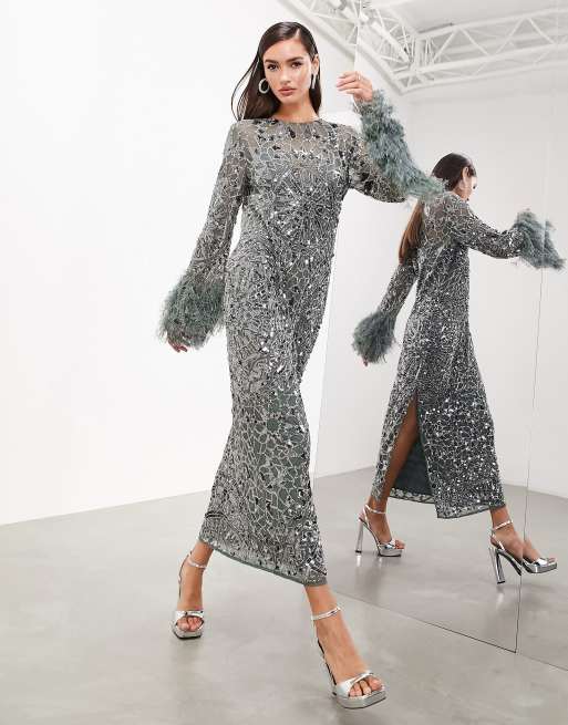 ASOS EDITION – Mörkgrå maxiklänning med geomönstrad utsmyckning, fuskfjäderfåll och långa ärmar