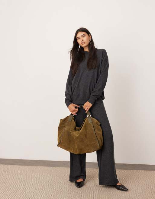 ASOS EDITION – Premium – Mörkgrått, stickat set i kashmirmix med tröja med huva och byxor med vida ben