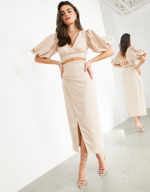 ASOS EDITION – Set med puffärmad topp och midaxikjol med lårslits