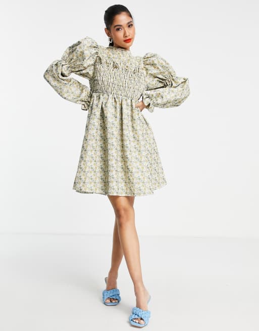 ASOS EDITION – Småblommig, jacquardvävd miniklänning med smockad byst