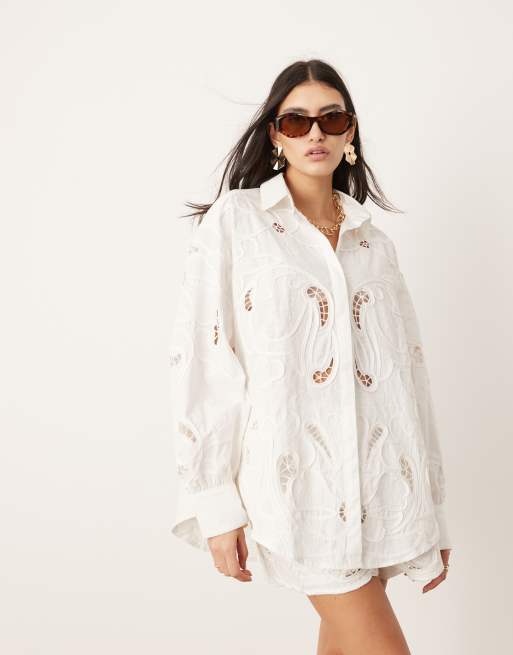 ASOS EDITION – Vit skjorta med boxig passform och broderie anglaise, del av set