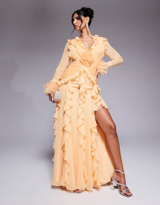 ASOS LUXE – Aprikosfärgad maxiklänning i organza med långa ärmar och många volanger