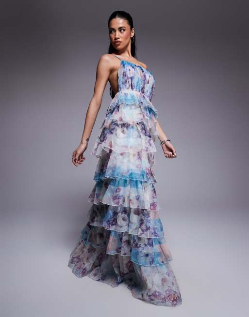 ASOS LUXE – Blommig maxiklänning i organza med asymmetrisk volang