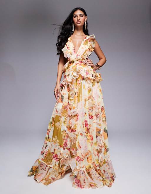 ASOS LUXE – Blommig maxiklänning i rynkad chiffong med djup halsringning, öppen rygg och lappad design