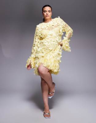 ASOS LUXE Curve – Ljusgul, 3D-blommigt utsmyckad miniklänning med fjäderimitationer i broderie anglaise