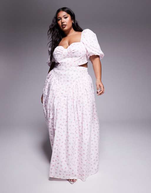 ASOS LUXE Curve – Småblommig maxikjol i bomullssatin med rosett baktill, del av set