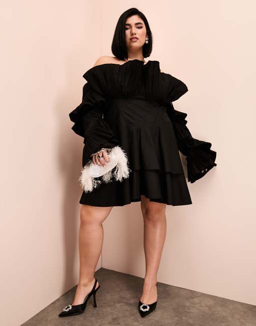 ASOS LUXE Curve – Svart, plisserad mini-skaterklänning i bomullspoplin och off shoulder-modell